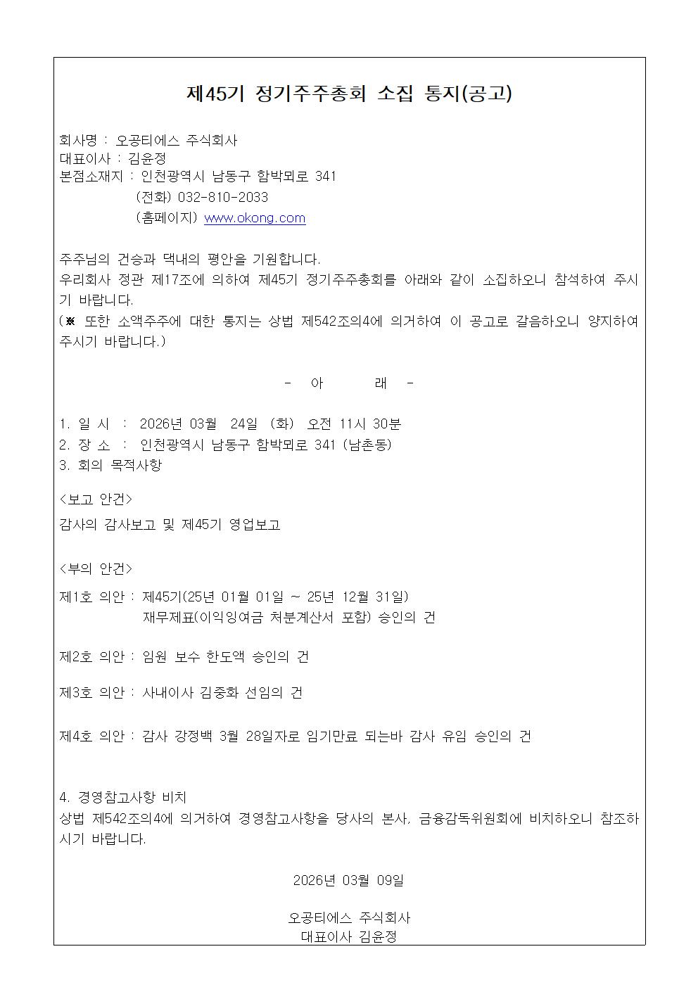 오공티에스(주) 제45기 정기주주총회 소집 통지(공고)